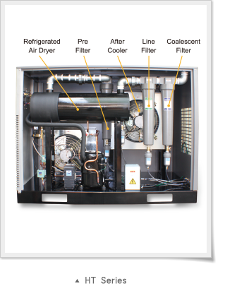 Basic Air Cleaning System dehumidification equipment is comprised of Refrigerated Air Dryer, after cooler, pre filter.Line filters, Coalescent filter (3 pcs) The problem from narrow installation location and high temp. of the compressed air are improved by One-System with combined several products. The products for maximizing efficient operation and the dehumidification efficiency are the HT-Series.